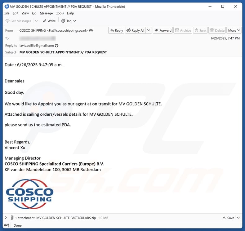QuirkyLoader è stato distribuito attivamente tramite malspam. Due campagne di spam via e-mail osservate nel 2025 hanno preso di mira una società di ricerca sulla sicurezza Internet, NUSOFT Taiwan, e hanno gettato una vasta rete per infettare gli utenti in Messico. La prima ha diffuso il Remcos RAT, mentre la seconda il keylogger Snake.
