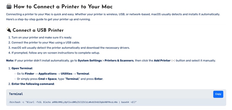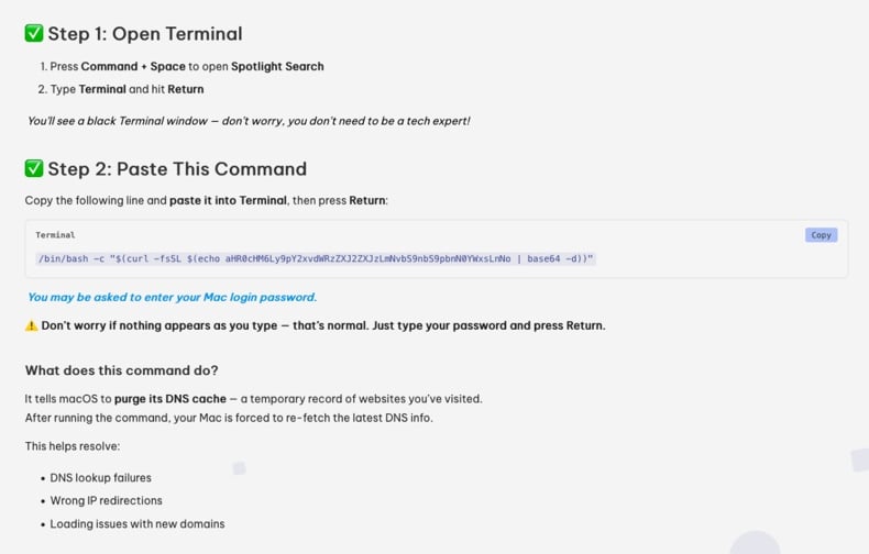 Come accennato in precedenza, Shamos si è diffuso tramite truffe ClickFix. L'elemento centrale di queste truffe è quello di indurre gli utenti a copiare/incollare ed eseguire un comando nel Terminale. Sono state rilevate diverse campagne ClickFix con diverse forme di camuffamento.