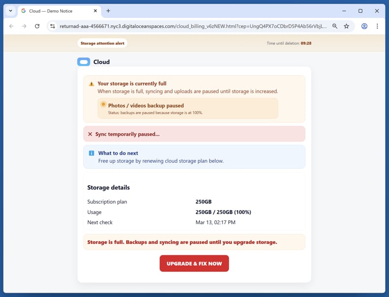 In conclusione, questa è una truffa progettata per indurre i destinatari a credere che il loro abbonamento all'archiviazione cloud sia scaduto e che i file possano andare persi a meno che i dati di pagamento non vengano aggiornati. Il suo obiettivo è fare pressione sugli utenti affinché clicchino su link malevoli che generano profitto per i truffatori attraverso il marketing di affiliazione.